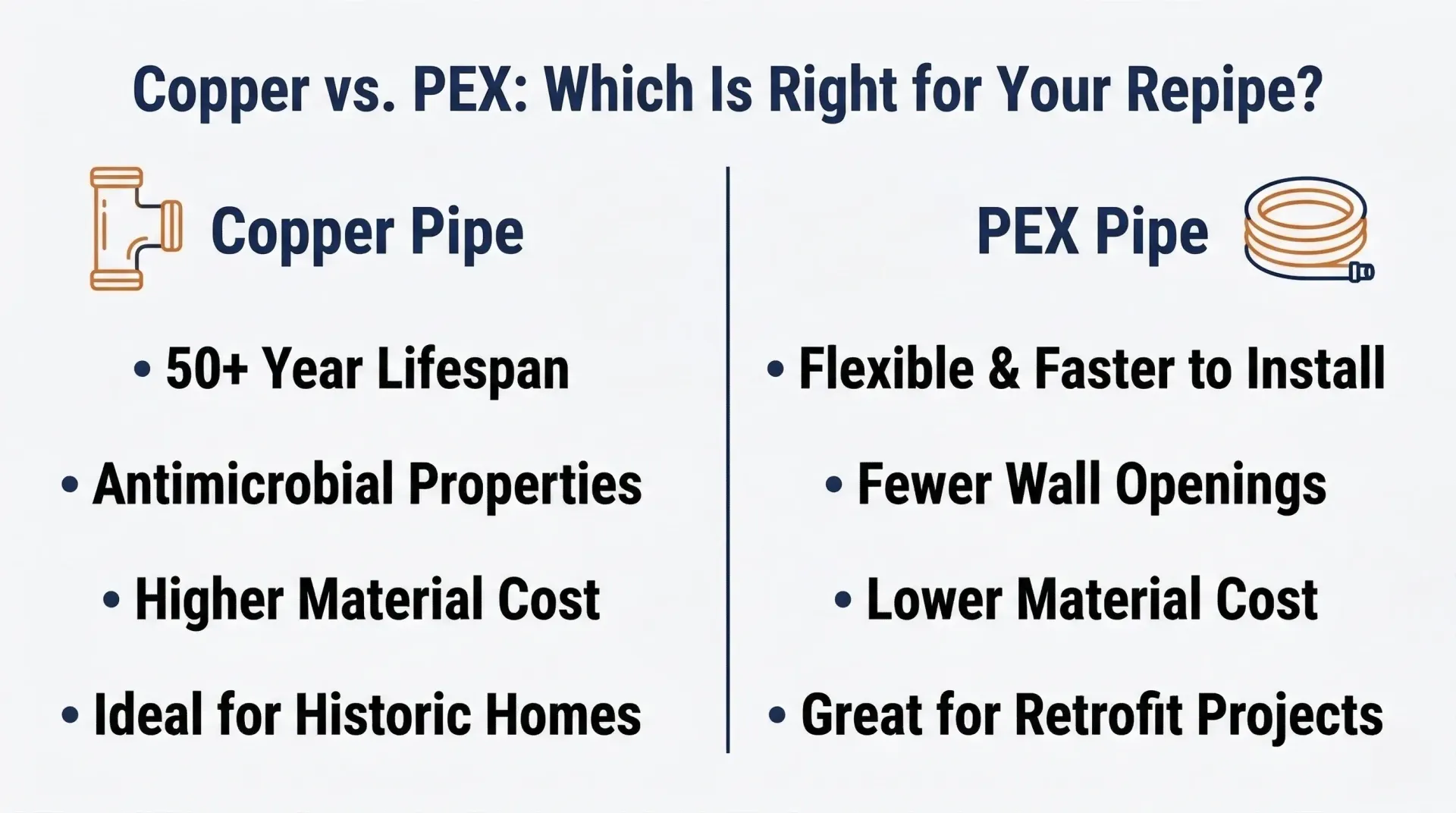 The pipe material you choose is one of the most consequential decisions in a repipe project. The two standard materials for whole-house repiping are copper and PEX (cross-linked polyethylene).